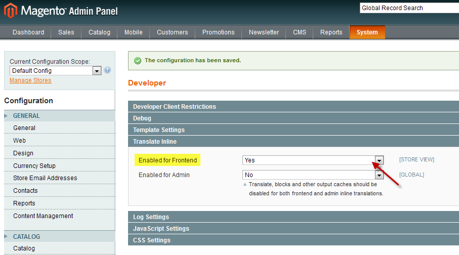 - หลังจากแปลภาษาไทยครบทุกจุดแล้ว อย่าลืมเข้าไปปิดการแปลภาษาที่หลังร้านนะคะ (ปิดการแปลภาษา ที่นี่ค่ะ System --> Configuration --> Developer --> Translate Inline --> Enabled for Frontend --> No)