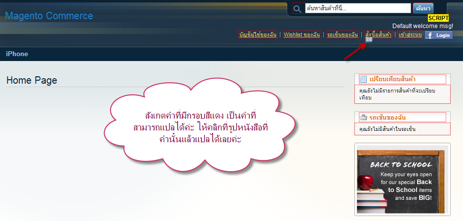 - ไปที่หน้าร้าน จะเห็นกรอบสีแดงขึ้น ดังรูป ให้คลิกที่รูปหนังสือตรงคำที่เราต้องการแปลให้เป็นภาษาไทย หรือต้องการใช้คำใหม่ที่ถูกใจเรา